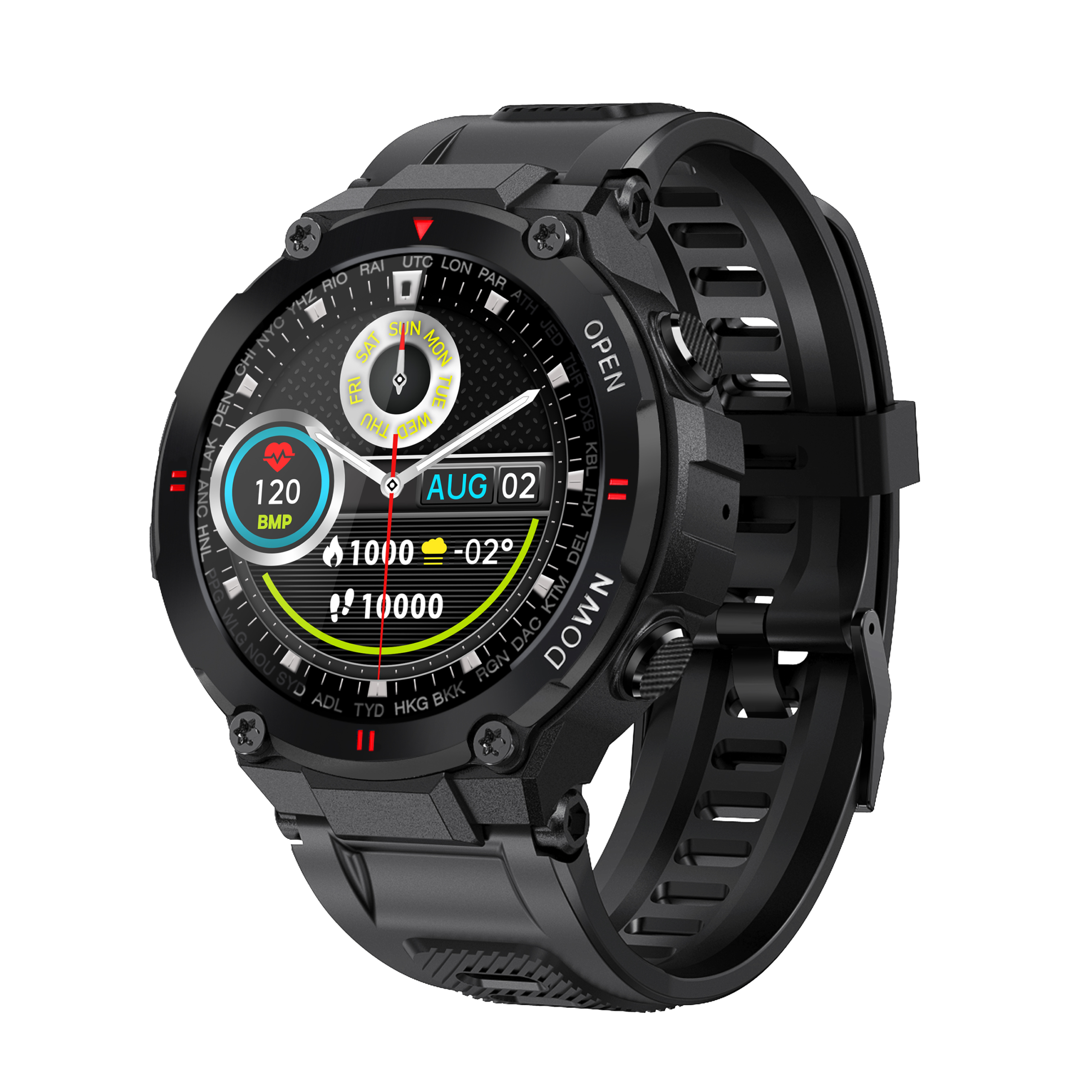 El modelo SMART ACTION , es un reloj deportivo para exteriores con más de 20 modos de deporte; datos precisos de oxígeno en sangre; monitor de frecuencia cardíaca para todo el día.